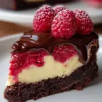 A delicious and decadent cheesecake featuring a brownie base topped with creamy cheesecake and fresh raspberries, offering a perfect blend of flavors and textures.