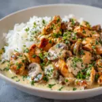 - Beilagen: Servieren Sie das Hühnchen Stroganoff mit fluffigem Reis oder al dente Nudeln, um die cremige Sauce perfekt aufzunehmen.