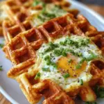 These waffles can be served with various toppings such as avocado cream, smoked salmon, or fresh salsa. Store leftovers in an airtight container for up to 3 days.