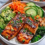 Diese knusprigen Lachs Bowls sind eine Mischung aus zartem Lachs, frischem Gemüse und einem schmackhaften Dressing, perfekt für eine gesunde Hauptmahlzeit.