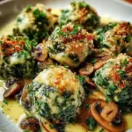 Ein komfortables Gericht mit zarten Knödeln aus frischem Spinat und cremigem Quark, serviert mit einem aromatischen Pilzragout.