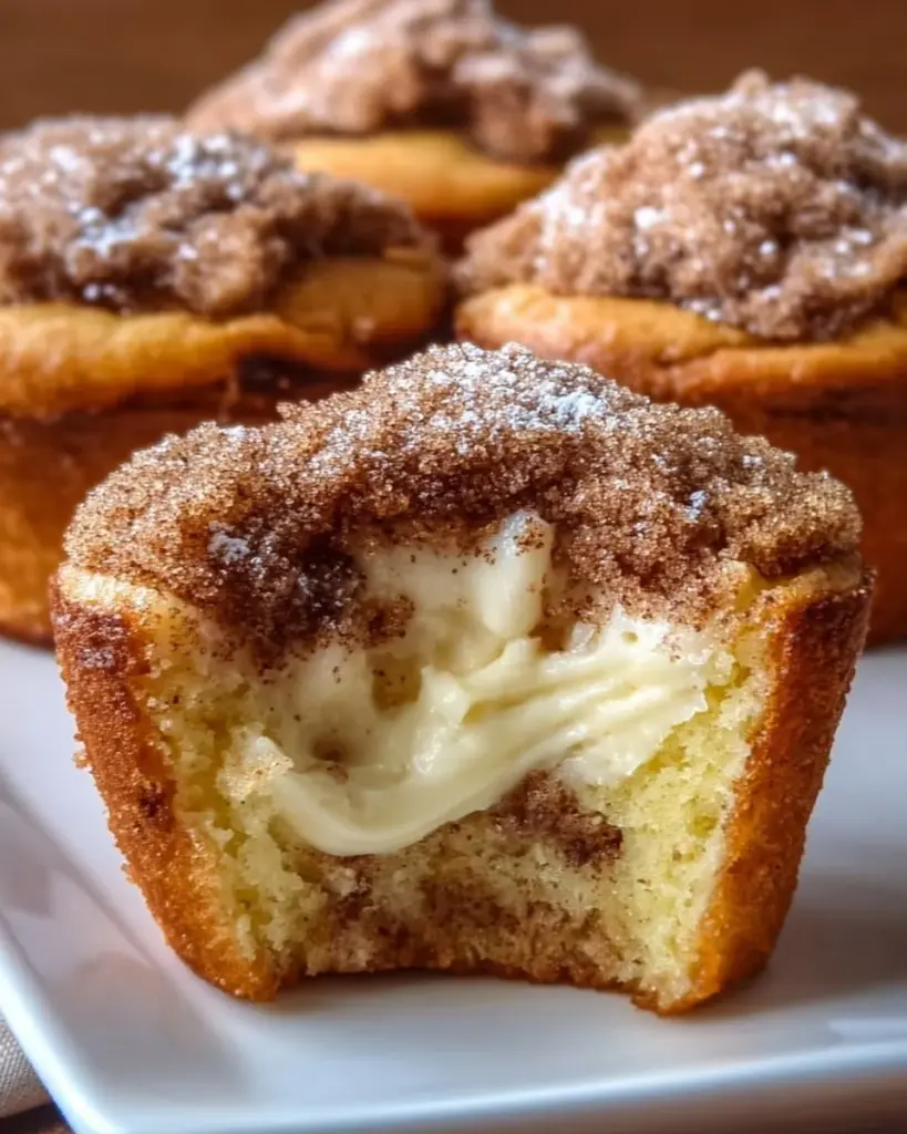 Zimt-Cheesecake-Muffins auf einem Teller, frisch gebacken und appetitlich dekoriert.
