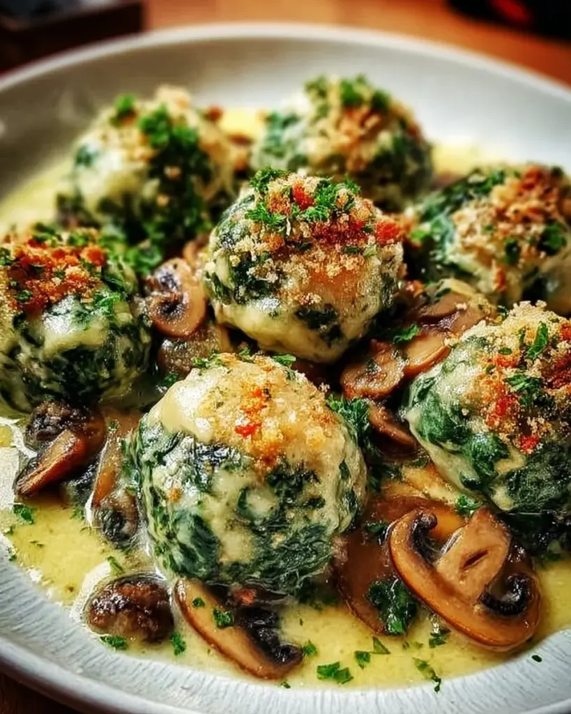 Spinatknödel serviert mit einer cremigen Champignonsoße auf einem Teller.